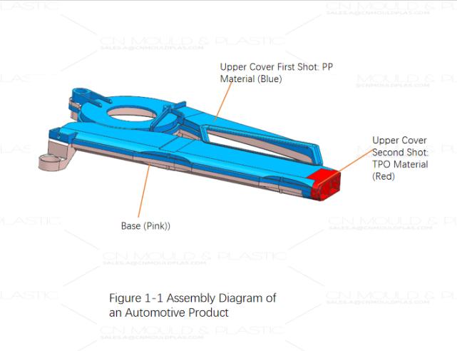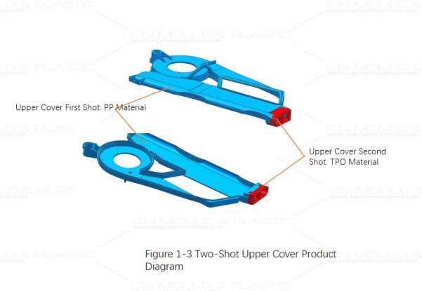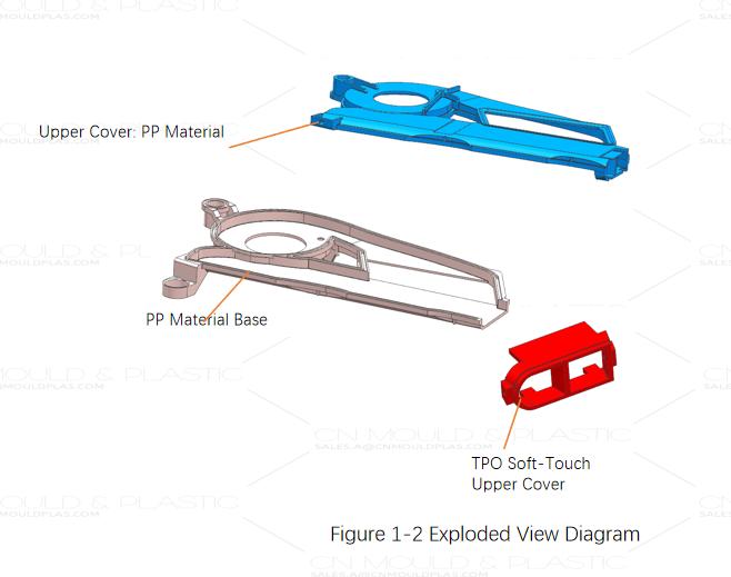 Figure 1-1 shows an assembly drawing of an automotive interior component. This part consists of three sub-components: an upper cover (PP material), a base (PP material), and a TEO component (elastomer, soft touch), as shown in Figure 1-2. The design is now modified to consolidate the TEO elastomer and upper cover into a single part via two-shot molding, as shown in Figure 1-3. Both the upper cover and base must be injection molded in the same tool.