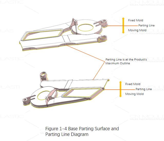 The ejection direction and parting line must be determined before mold design. The base is a simple single-shot part, so the parting line directly follows its maximum contour. Figure 1-4 shows the base's parting line and ejection direction.