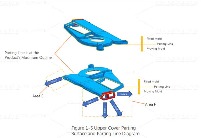 The upper cover is more complex. Figure 1-5 shows its parting surfaces and parting lines. Based on plastic part design experience, Area F (see Figure 1-5) is the core of this mold design. This area has undercuts on three sides, requiring multiple sliders for forming. Area E is relatively simpler and can be handled with a single slider.