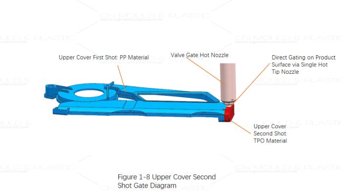 The second-shot TEO elastomer volume is small and can also be gated via a single valve-gated hot nozzle, as shown in Figure 1-8.