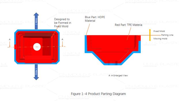 Before analyzing the ejection direction, let’s first examine the characteristics of TPE: TPE is a thermoplastic elastomer that can be plasticized and molded at high temperatures. For this two-color product, if the first shot injects the inner soft TPE, the soft TPE product is prone to softening and deformation during the injection of the second shot (hard plastic), which could affect the bonding performance of the two materials and compromise product quality. Clearly, for this two-color product, the first shot must inject the hard HDPE compound, followed by the second shot injecting the soft TPE.